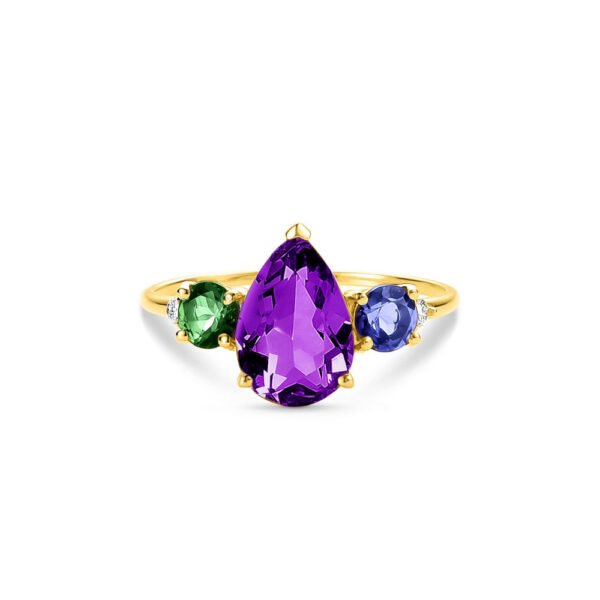 Anel Pietre em Ouro Amarelo 18k com Ametista Roxa, Turmalina Verde, Iolita e Diamante