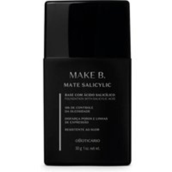 A Base Líquida Make B. Mate Salicylic é inovação para sua maquiagem , entregando um efeito mate atemporal segundos após a aplicação, além de tratar e controlar a oleosidade por até 18 horas. Essa tecnologia proporciona os seguintes benefícios: Controle do Brilho;Resistente ao Suor;Disfarça os poros e protege contra a acne.Não craquela. A nova fórmula ultrafluída foi desenvolvida por nosso Laboratório Expert Dermomake e traz o Ácido Salicílico, ativo que age no controle da oleosidade , além de ser um poderoso anti-inflamatório. O resultado é uma pele aveludada e uniforme o dia todo. A base Make B. cresceu: assim como há uma rica diversidade de tons da pele brasileira, apresentamos uma rica diversidade de cores com 24 tonalidades , para você escolher a que combina com a sua pele. A super fluída cor 270 garante média cobertura para a pele de subtom quente. Sua nova embalagem foi pensada para dar mais praticidade ao seu dia a dia. É menor, mais leve e mais sustentável, ideal para ser levada na bolsa, mochila ou nécessaire. A Base Líquida Mate Salicylic faz parte da linha Make B. ,pioneira quando o assunto é dermomake, para uma maquiagem que trata a pele. Além de destacar a sua beleza, entrega ativos de skincare de alta performance com sofisticação. Nenhum produto do Boticário é testado em animais, ou seja, este item possui selo Cruelty Free.
