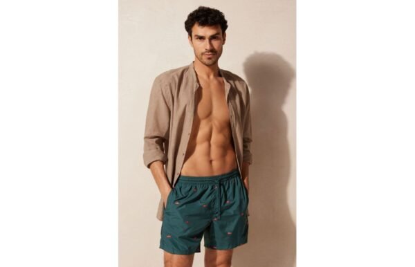 Bermuda de banho com bordado de peixes-palhaço em tecido impermeável, macio, leve e de secagem rápida. Apresentam um confortável forro estilo cueca em malha suave na mesma cor. Possuem práticos bolsos laterais e um bolso na parte de trás. A cintura com elástico ajustável tem uma prática abertura lateral para chaves. Corte regular com comprimento até o meio da coxa. O modelo mede 1,85 m de altura e veste o tamanho G.