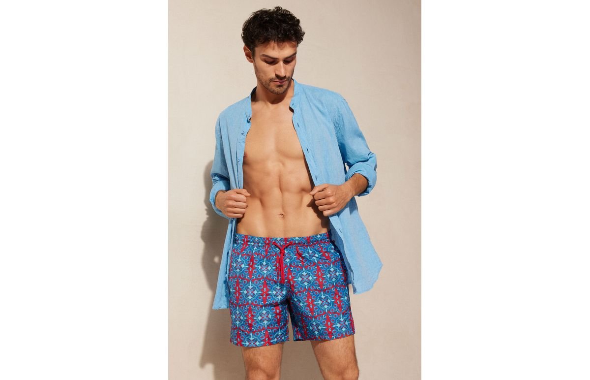 Bermuda de banho com estampa marroquina em tons de vermelho, em tecido à prova d’água, macio, leve e de secagem rápida. Apresentam um confortável forro em forma de cuecas em malha macia na mesma tonalidade. Caracterizam-se pelos práticos bolsos laterais e por um bolso na parte posterior. A cintura é franzida com cordão e possui uma prática abertura lateral para chaves. Corte reto com comprimento até a metade da coxa. O modelo mede 1,85 m de altura e veste o tamanho G.