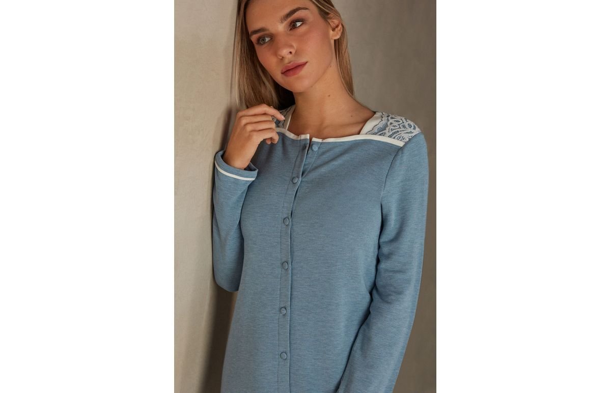 Blusa de manga comprida aberta à frente com botões e decote quadrado. Acabamentos de cor contrastante e detalhes românticos em renda bicolor. Botões forrados. Vestibilidade macia.A modelo mede 1,75 m de altura e veste o tamanho P.