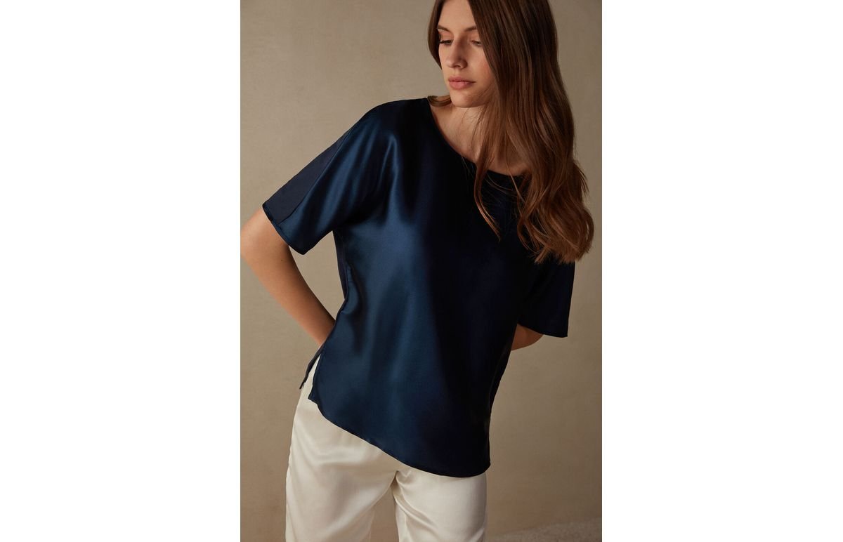 Camisola com corte quimono de manga curta pelo cotovelo e amplo decote redondo. A parte dianteira é realizada em cetim de seda pura e a parte posterior em modal macio. Rachas laterais. Vestibilidade macia.A modelo tem 175 cm de altura e veste o tamanho 2 / S.A seda desta peça é certificada bluesign®.