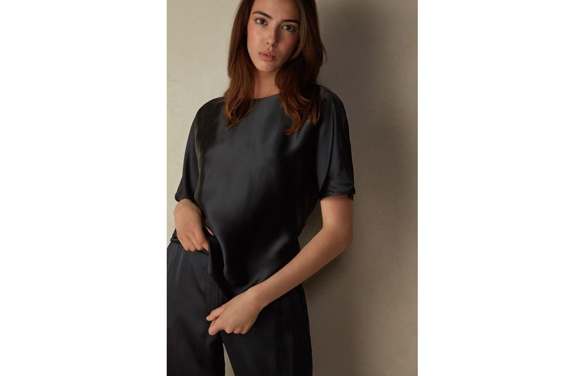 Camisola com corte quimono de manga curta pelo cotovelo e amplo decote redondo. A parte dianteira é realizada em cetim de seda pura e a parte posterior em modal macio. Rachas laterais. Vestibilidade macia.A modelo tem 175 cm de altura e veste o tamanho 2 / S.A seda desta peça é certificada bluesign®.