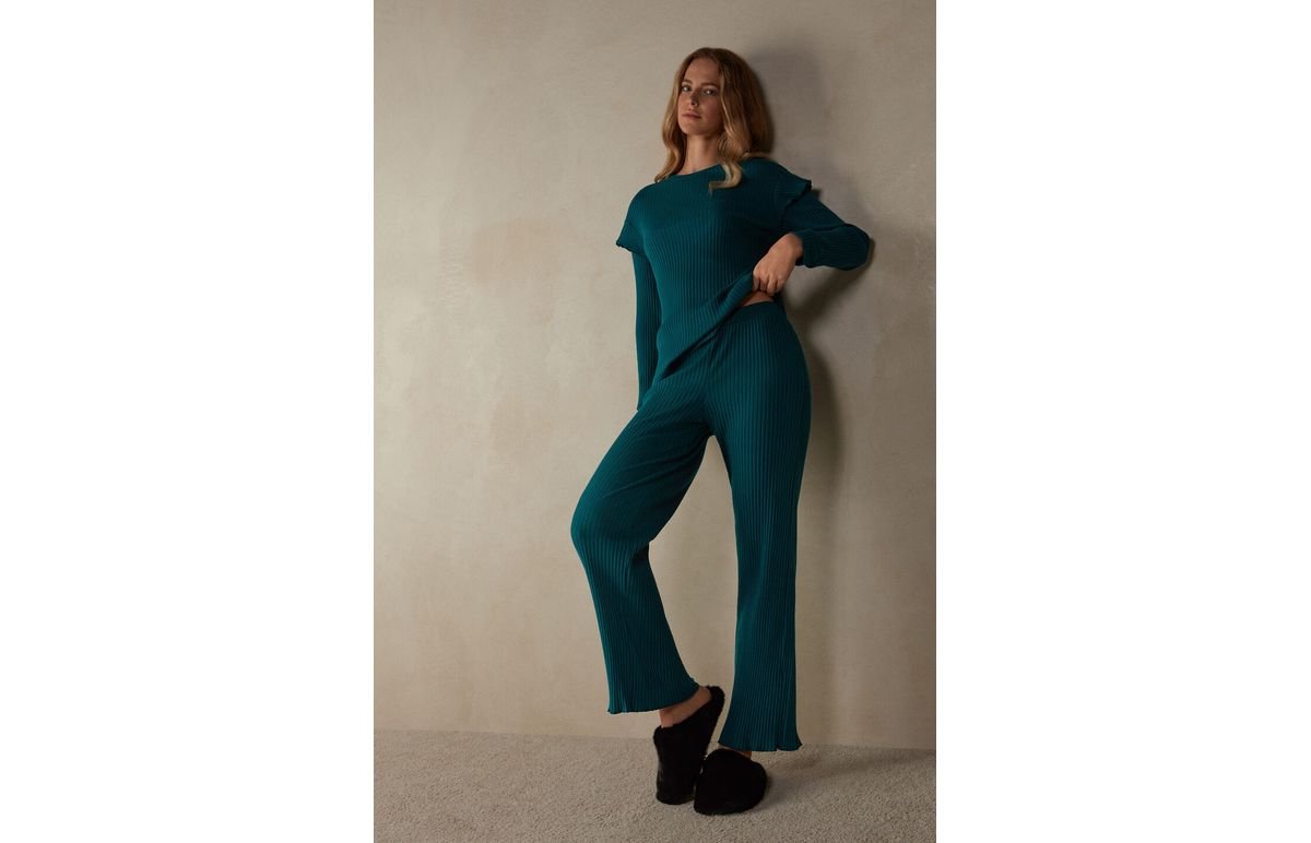 Calça comprida de modelagem reta confeccionada em algodão canelado. Possui aplicalão de franzido na parte inferior da perna. Modelagem justa.A modelo mede 1,75 m de altura e veste o tamanho S.