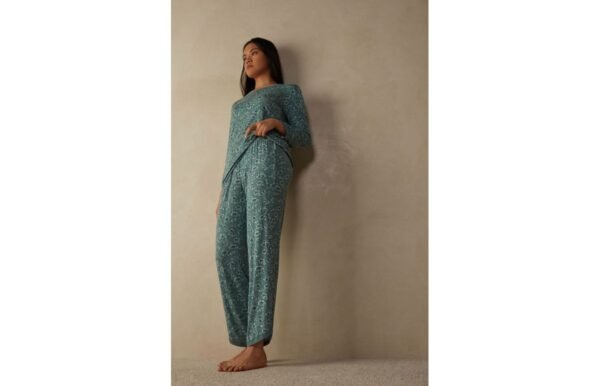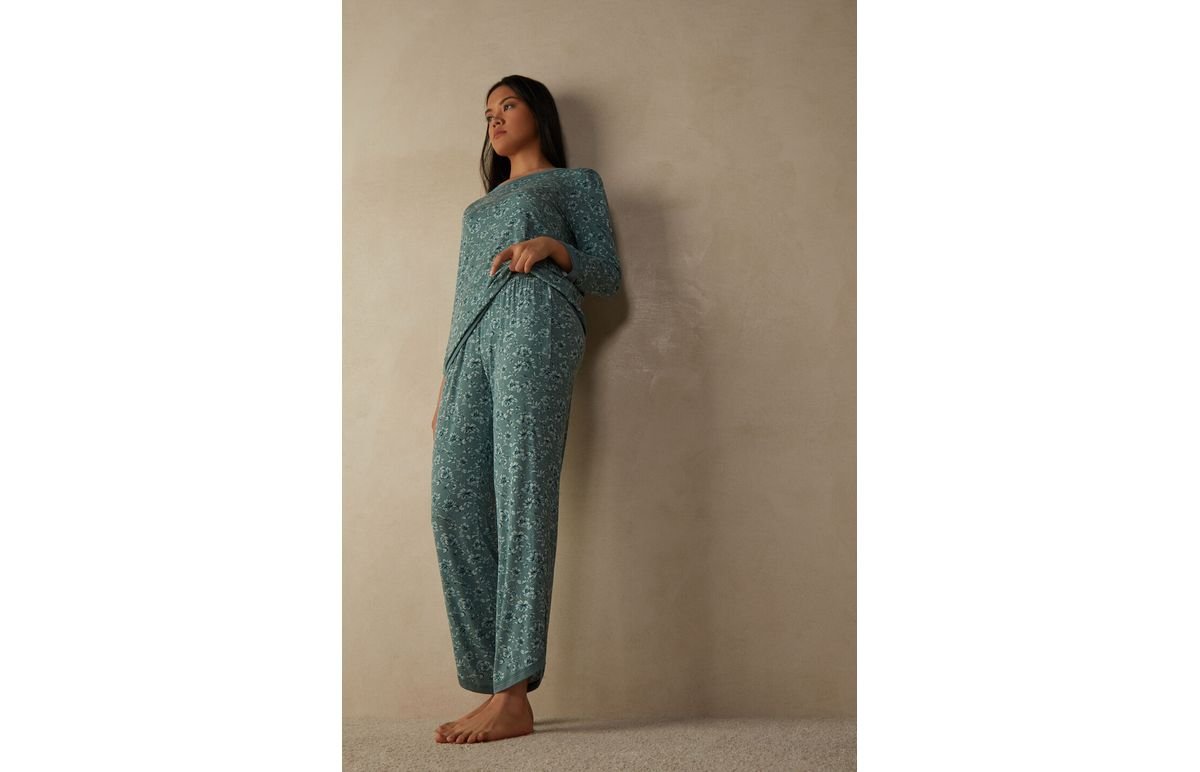 Calça em macio jersey de viscose de bambu com romântica estampa de flores tom sobre tom. Peça de cor lisa tom sobre tom. Parte inferior da calça com corte especial.A modelo mede 1,75 m de altura e veste o tamanho P.