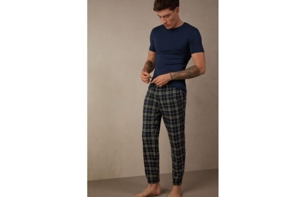 Calça em tela de algodão com estampa xadrez, cordão e bolsos laterais. Corte regular.O modelo mede 1,85 m de altura e veste o tamanho G.
