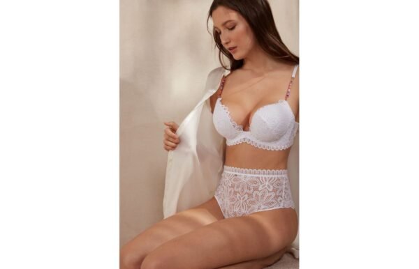 Calcinha brasileira de cintura alta confeccionada numa renda macramé elegante e refinada. Entrepernas em 100% algodão. A modelo mede 1,75 m de altura e veste o tamanho P. A renda desta peça contém fio de poliamida reciclado.