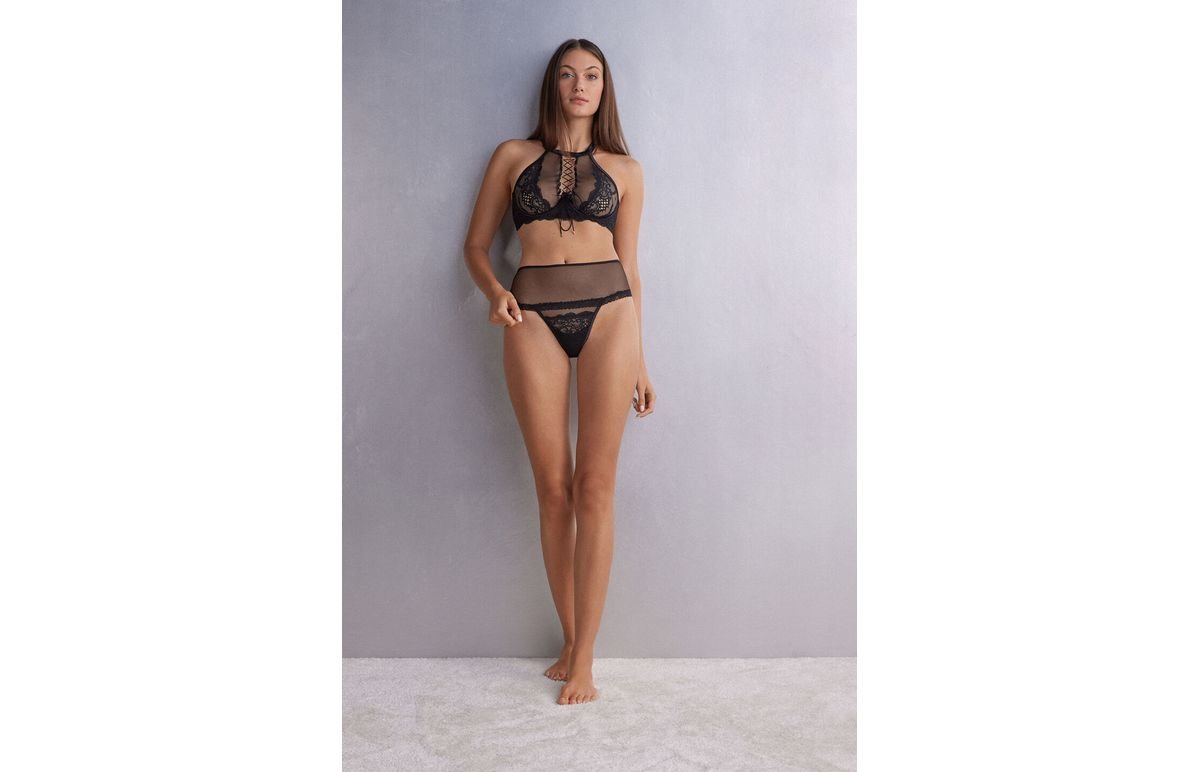 Calcinha brasileira de cintura alta, confeccionada em tule e renda elásticos, caracterizada pelo detalhe cruzado central e pequenos berloques dourados, causando um efeito sensual à peça. Acabamentos em cetim. Entrepernas em 100% algodão.A modelo tem 1,75m de altura e veste o tamanho PP.