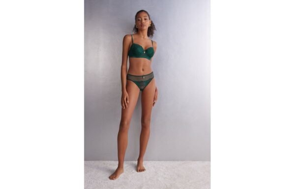 Calcinha em tule enfeitada com um elegante bordado floral. Detalhe de um amuleto em forma de beija-flor, removível, ornamentado com pequenos strass. A parte posterior é feita de tule forrado, sem costuras nas bordas. Entrepernas em 100% algodão. A modelo tem 1,75 m de altura e veste o tamanho P.”This Is Me…Now” é o nome da coleção de Jennifer Lopez, inspirada no próximo álbum que explora sua profunda jornada de transformação, crescimento pessoal, autorreflexão e autoconhecimento. A coleção habilmente transmite esses conceitos de evolução e força interior por meio de lingerie que incorpora o refinamento moderno e a ideia de emancipação.