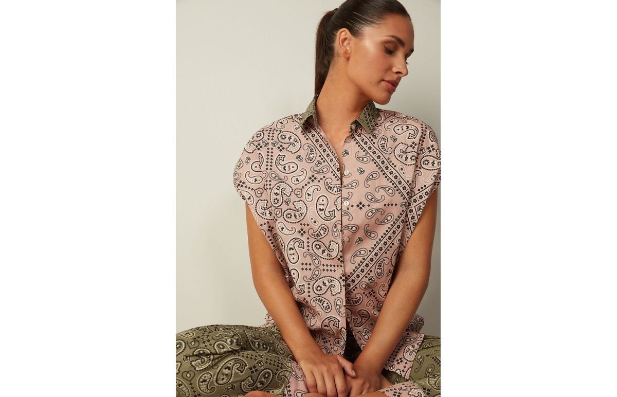 Camisa arredondada em tela de algodão com estampa de bandana. Alças com aberturas laterais e gola em cor contrastante. Para um visual mais casual pode ser amarrada na cintura.