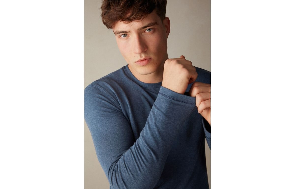 Blusa de manga comprida de homem com gola redonda, confeccionada em modal com misto de cashmere. Peça confortável e macia. O modelo tem 185 cm de altura e veste o tamanho G.