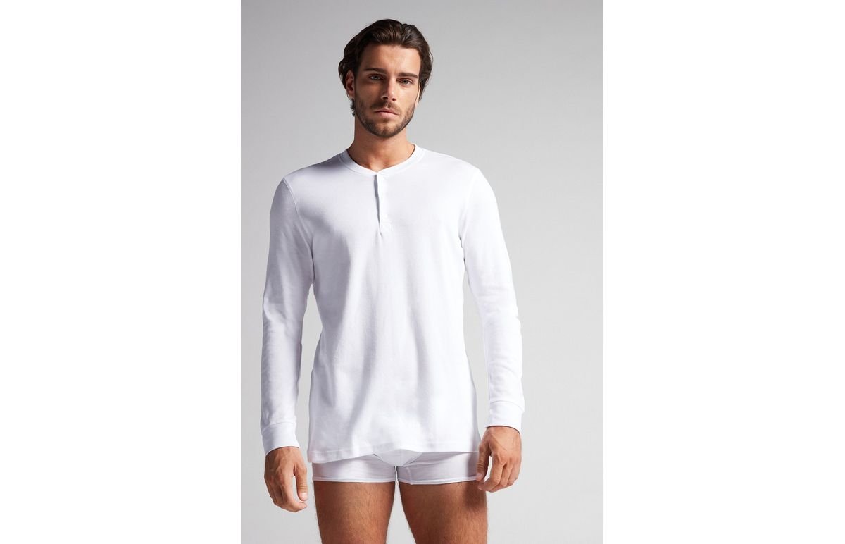 Blusa de manga comprida confeccionada em interlock Supima. A peça apresenta uma gola tunisina com botões.