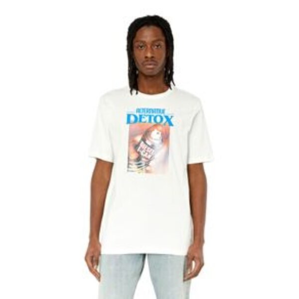 Camiseta masculina de algodão com corte regular. O gráfico é uma impressão irônica que retrata uma lata de spray desinfetante com o logotipo da Diesel, encimado pelas palavras “Alternative Detox”.
