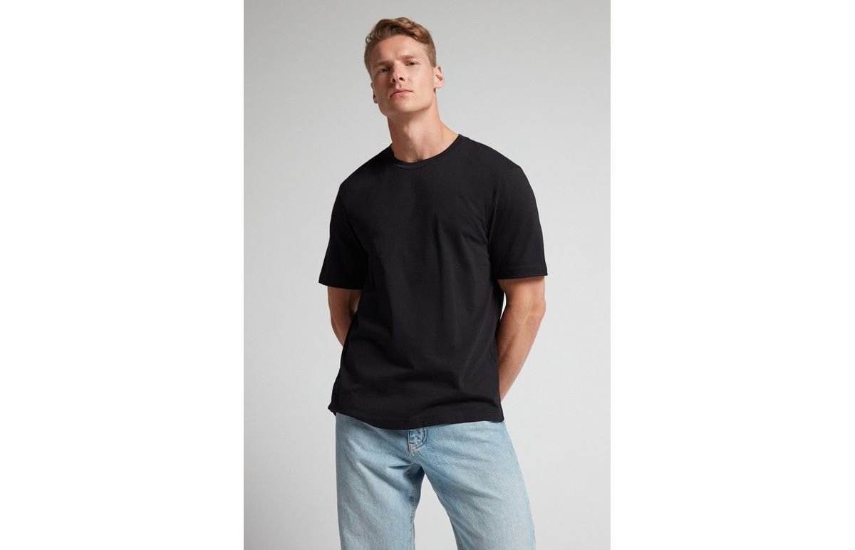 Camiseta com decote redondo de manga curta em jersey de algodão. Com corte reto, é ideal para usar com um casaco ou sozinha para um visual mais informal.