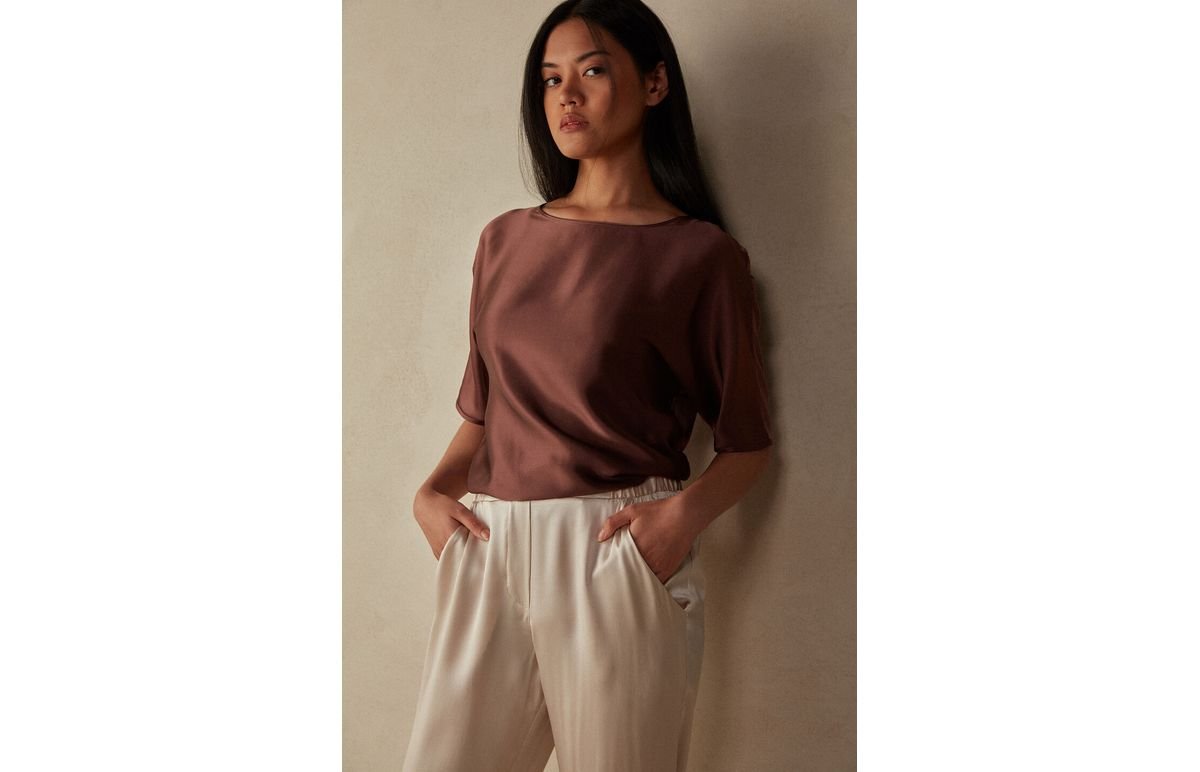 Camisola com corte quimono de manga curta pelo cotovelo e amplo decote redondo. A parte dianteira é realizada em cetim de seda pura e a parte posterior em modal macio. Rachas laterais. Vestibilidade macia.A modelo tem 175 cm de altura e veste o tamanho 2 / S.A seda desta peça é certificada bluesign®.