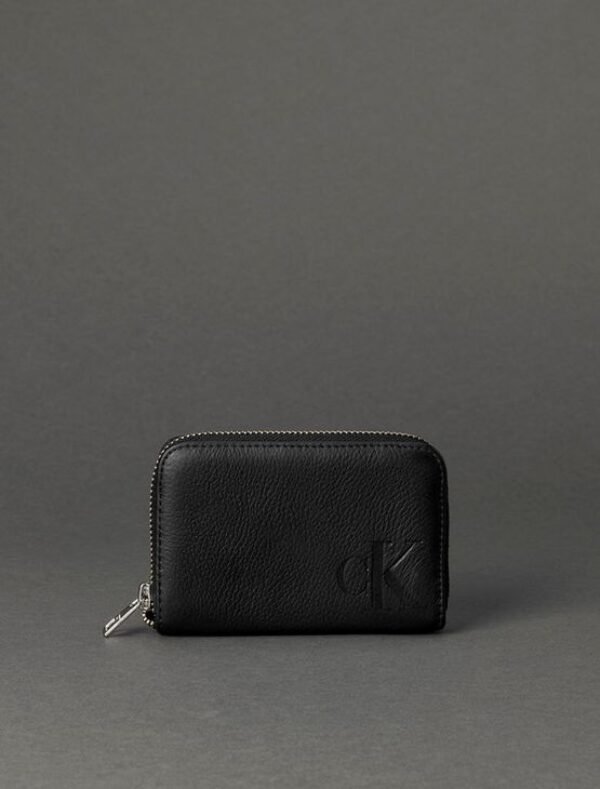 Carteira Pequena Calvin Klein Jeans feminina de couro, queima baixo relevo exclusivo da marca. Fechamento por zíper de metal personalizado. Interno com quatro divisórias. Medidas: 12,5 cm X 8 cm.