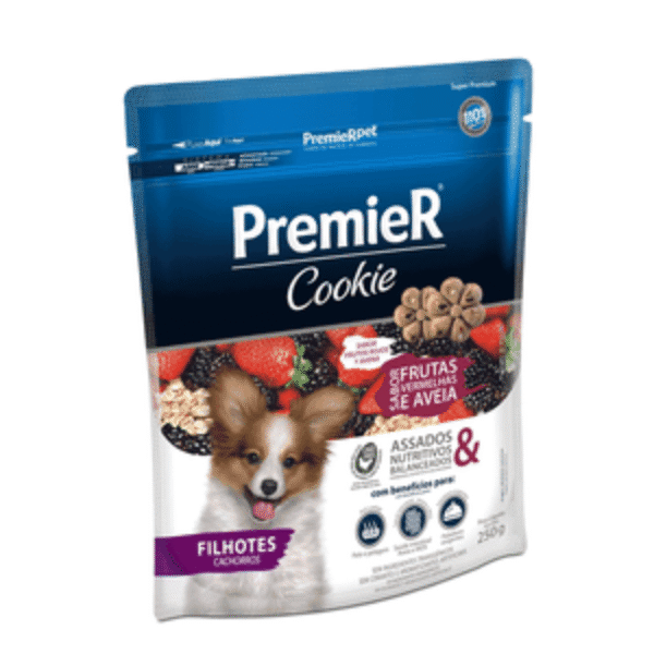 Cookie Premier Cães Filhotes Frutas Vermelhas e AveiaChamados de melhores amigos do homem, os cães nos oferecem amor incondicional e amizade verdadeira, e com o intuito de retribuir todo esse sentimento a Premier Pet criou o Cookie Premier Cães Filhotes Frutas Vermelhas e Aveia.Cookie Premier é assado, saudável e nutritivo reunindo qualidade, saúde e sabor com ingredientes rigorosamente selecionados para uma satisfação comprovada.Indicado para cães filhotes, contém todos os benefícios da Premier Pet e ingredientes saudáveis como a combinação do morango, amora e aveia promovendo ainda mais sabor aos biscoitos.Este produto é indicado como complemento alimentar para cães filhotes e não substitui o alimento completo.IngredientesFarinha de trigo, proteína isolada de suíno, ovo desidratado – proveniente de galinhas livres de gaiola, albumina, leite desnatado em pó, quirera de arroz, amido de milho, dextrina, fibra de trigo, colágeno, aveia (5%), frutas vermelhas desidratadas – morango e amora (1,0%), farinha de arroz, corantes naturais (carmim de cochonilha, beterraba, urucum e clorofila), ácido cítrico, goma xantana, gordura suína, antioxidante (tocoferol e extrato de alecrim), bicarbonato de sódio, carbonato de cálcio, biotina, hidrolisado de fígado suíno, mananoligossacarídeos (0,2%), zinco aminoácido quelato.Níveis de garantiaUmidade (Máx.)100g/kg (10%)Proteína Bruta (Mín.)190g/kg (19%)Extrato Etéreo (Mín.)160g/kg (16%)Matéria Fibrosa (Máx.)30g/kg (3%)Matéria Mineral (Máx.)30g/kg (3%)Cálcio (Mín.)1.000mg/kg (0,1%)Cálcio (Máx.)5.000mg/kg (0,5%)Fósforo (Mín.)1.000mg/kg (0,1%)Sódio (Mín.)1.500mg/kg (0,15%)Energia metabolizável4.279 kcal/kg e 15 kcal por unidadeEnriquecimento por Kg do produtoBiotina 3,0 mg; zinco 60 mg.Sugestão de uso* (Cookies/dia)Peso do cãode 2 a 3 mesesde 4 a 12 meses2 a 3 kg1 unidade1 unidade4 a 5 kg1 unidade1 unidade6 a 10 kg2 unidades2 unidades11 a 15 kg2 unidades4 unidades16 a 20 kg3 unidades4 unidades21 a 30 kg4 unidades6 unidades31 a 40 kg5 unidades7 unidadesAcima de 41 kg6 unidades9 unidades*Recomenda-se adequar a quantidade do alimento usual do seu cão para manutenção do peso corporal.Na Cobasi, você encontra o Cookie Premier Cães Filhotes Frutas Vermelhas e Aveia com preço especial.