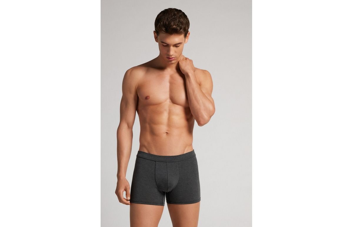 Cueca Boxer em modal e seda, que se destacam pelo tecido macio e envolvente, bem como pelo efeito elegante e sofisticado. Possuem elástico macio revestido e se ajustam suavemente ao corpo.