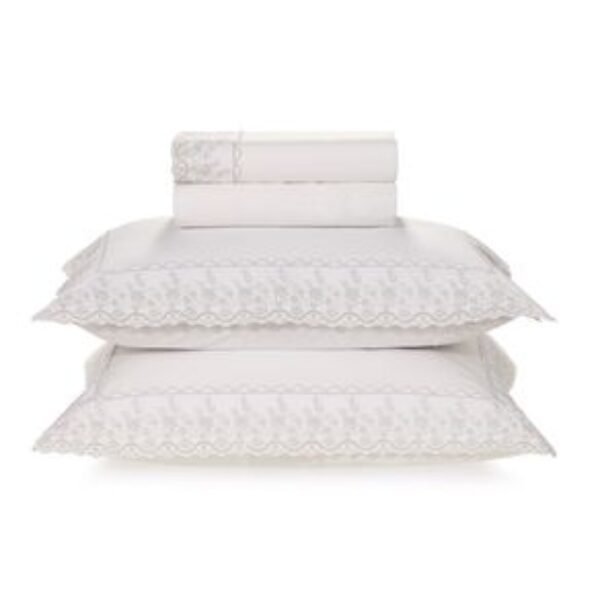Jogo de Cama Queen 200 Fios Bordado Antônia Branco/PrataFabricado inteiramente em algodão,o jogo de cama Antônia oferece não apenas conforto, mas também a suavidade característica de um material de alta qualidade. Tendo uma contagem de 200 fios e 100% algodão, o tecido apresenta uma textura macia ao toque. Sua cor branca remete um estilo clássico junto de tiras em bordado prata que adicionam elegância ao seu adorno.Pode haver pequena variação de cor, de acordo com a configuração e modelo do monitor ou do aparelho celular. Consultar a cor nas especificações técnicas do produto.Selo algodão Soft Conheça o Algodão Soft , selo exclusivo Karsten! Um processo inovador que resulta e um toque suave e leve brilho, proporcionando um conforto sensorial único. O Percal, tecido denso e macio, traz aconchego e frescor perfeito para o clima brasileiro. O Algodão Soft garante maior respirabilidade, tornando suas noites de sono incrivelmente confortáveis para acordar revigorado a cada novo dia.Renovar Tons solares, com trabalhados lindos para iluminar o quarto com a arte da natureza brasileira. Banhados na luz do sol, as cores trazem tons com propriedades restauradoras e pigmentos nutritivos, com o verde, amarelo e vermelho em destaque criando uma identidade mais romântica e delicada ao ambiente.