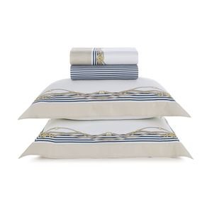 Jogo de Cama Queen 300 Fios 100% Algodão Egípcio Galizzi Inspirado na aura náutica e eterna de La Cala di Palermo, o jogo de cama Galizzi Queen leva ao ambiente o frescor e a sofisticação das paisagens costeiras da Sicília. Com traços desenhados à mão, sua estampa remete ao charme sereno das embarcações da Marina Galizzi, com cordas trançadas e listras suaves que evocam a beleza atemporal do porto italiano. Desenvolvido em cetim 300 fios com algodão egípcio e acabamento sanforizado e mercerizado, proporciona toque acetinado e conforto elevado. O sobre lençol estampado mede 2,40 m x 2,80 m, acompanhado por duas fronhas de 50 cm x 70 cm com 3 abas e estampa dimensionada. O lençol com elástico, de 1,60 m x 2,00 m x 45 cm, ajusta-se com perfeição. Um conjunto que traduz elegância e arte com naturalidade. Inspirada pela luz dourada e pelo ritmo sereno da Sicília, a linha Cama Trussardi transforma o cotidiano em um ritual de beleza e bem-estar. Cada peça carrega o cuidado dos detalhes e a elegância atemporal, refletindo a riqueza cultural da ilha e sua atmosfera de contemplação. Assim como o tempo desacelera nas vilas sicilianas, o ambiente se torna um refúgio de tranquilidade. Os tecidos suaves, as tramas precisas e os acabamentos refinados evocam o conforto de um lar que acolhe com leveza. É uma coleção pensada para celebrar o descanso como experiência sensível, onde o toque é memória, o silêncio é poesia, e cada noite carrega o encanto de um novo começo.