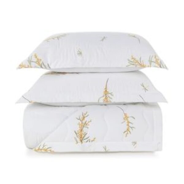 Jogo de Colcha King 300 Fios 100% Algodão Egípcio Mimosa A colcha Mimosa King convida a reviver o encanto da Isola Bella através de suas pinceladas suaves em aquarela, inspiradas nas árvores de mimosa que adornam a paisagem mediterrânea. Feita em cetim 300 fios com algodão egípcio, proporciona brilho sutil, textura delicada e conforto absoluto. Acompanhada por porta-travesseiros estampados coordenados, essa peça transforma o quarto em um cenário de harmonia e frescor, onde a natureza e o design italiano se unem com elegância. Um toque de poesia para quem busca transformar o cotidiano em uma experiência sensorial inesquecível Inspirada pela luz dourada e pelo ritmo sereno da Sicília, a linha Cama Trussardi transforma o cotidiano em um ritual de beleza e bem-estar. Cada peça carrega o cuidado dos detalhes e a elegância atemporal, refletindo a riqueza cultural da ilha e sua atmosfera de contemplação. Assim como o tempo desacelera nas vilas sicilianas, o ambiente se torna um refúgio de tranquilidade. Os tecidos suaves, as tramas precisas e os acabamentos refinados evocam o conforto de um lar que acolhe com leveza. É uma coleção pensada para celebrar o descanso como experiência sensível, onde o toque é memória, o silêncio é poesia, e cada noite carrega o encanto de um novo começo.