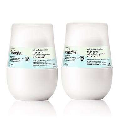 Viva seu corpo livre e protegido. Complete seu cuidado diário com nossos desodorantes roll-on Tododia. Com ação prebiótica que ajuda no controle do mau odor e oferece proteção 48h contra os efeitos do suor. Sua fórmula exclusiva cuida da pele, mantém a hidratação natural e possui secagem rápida que não deixa a pele úmida e nem pegajosa. Evita manchas em roupas claras e escuras. Benefícios: • Ação prebiótica: controla as bactérias que causam o mau odor. •48 horas de proteção desodorante e antitranspirante. • Cuida e mantém a hidratação com Vitamina E. • Proteção invisível: não mancha roupas claras ou escuras. • Secagem rápida: pele macia, hidratada, sequinha e protegida o dia todo. •Produto vegano. • Dermatologicamente testado. • Embalagem exclusiva de 70 ml: rende 40% a mais que os desodorantes que encontramos comumente no mercado. Conteúdo: desodorante antitranspirante roll-on Tododia flor de lis, 2 unidades de 70 ml cada.