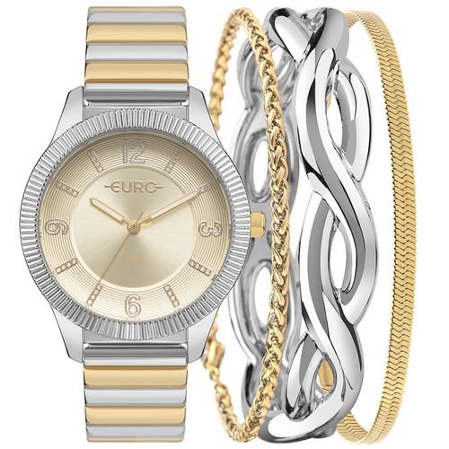 A Soul é a coleção de kit da Euro, com relógios sofisticados e que acompanham um trio de pulseiras para combinar! Modelo com pulseira dourada e prata que já era sucesso de vendas no solo agora em versão com acessórios.