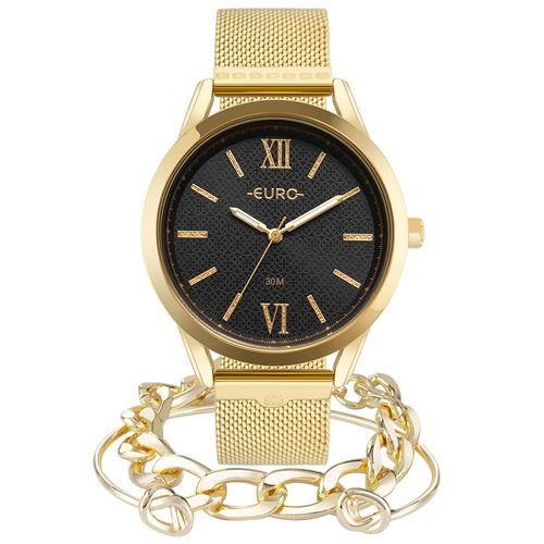 Para ressaltar a essência da mulher Euro, a Coleção Euro Soul traz kits exclusivo com o monograma como destaque principal. Com uma caixa redonda dourada de 40mm, mostrador preto e um conjunto com um par de braceletes com um design super sofisticado, essa é uma composição super poderosa para a mulher Euro
