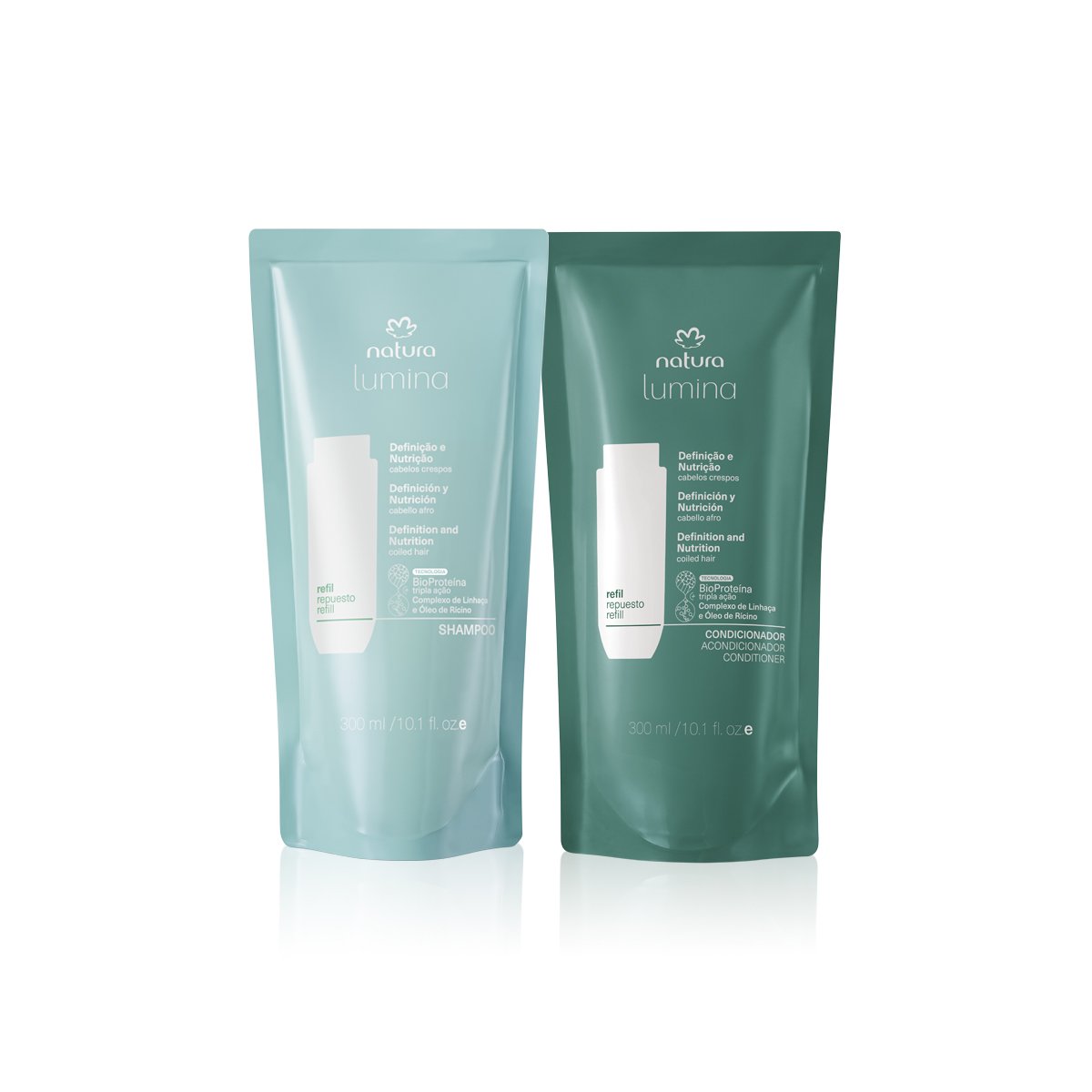 a linha para cabelos crespos de Lumina mudou! agora o seu Sistema de Definição e Nutrição tem novas embalagens, nova fragrância e ainda mais tecnologia para cuidar do seu cabelo. com BioProteína Tripla Ação e Complexo de Linhaça e Óleo de Rícino, esse sistema promove cabelos crespos até 73% mais definidos e com 2 vezes mais brilho*. este kit traz o refil do Shampoo Hidratante, que limpa sem ressecar e promove a hidratação dos fios, e o refil do Condicionador Nutritivo, que nutre, fortalece e deixa os cabelos 6 vezes mais macios. benefícios: shampoo: limpeza suave, hidratação e definição dos cachos. condicionador: nutrição, fortalecimento e maciez intensa. conteúdo: 1 refil Shampoo Hidratante 300 ml 1 refil Condicionador Nutritivo 300 ml