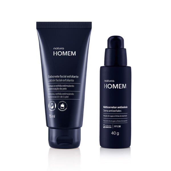 • sabonete esfoliante que estimula a renovação da pele • prático e eficaz, pode ser aplicado até 4 vezes por semana • ajuda a remover o excesso de oleosidade e as células mortas • feito com óleo de babaçu, que contribui no reforço da barreira cutânea e do mecanismo de defesa da pele • multicorretor antissinais que reduz a intensidade das rugas e linhas de expressão • hidrata desde o primeiro uso e controla a oleosidade da pele • fórmula com FPS 30 • produtos com exclusiva tecnologia DermoTech®, desenvolvida especialmente para a pele masculina, que protege contra as agressões da rotina. contém sabonete facial esfoliante 75 ml e multicorretor antissinais 40 gramas.