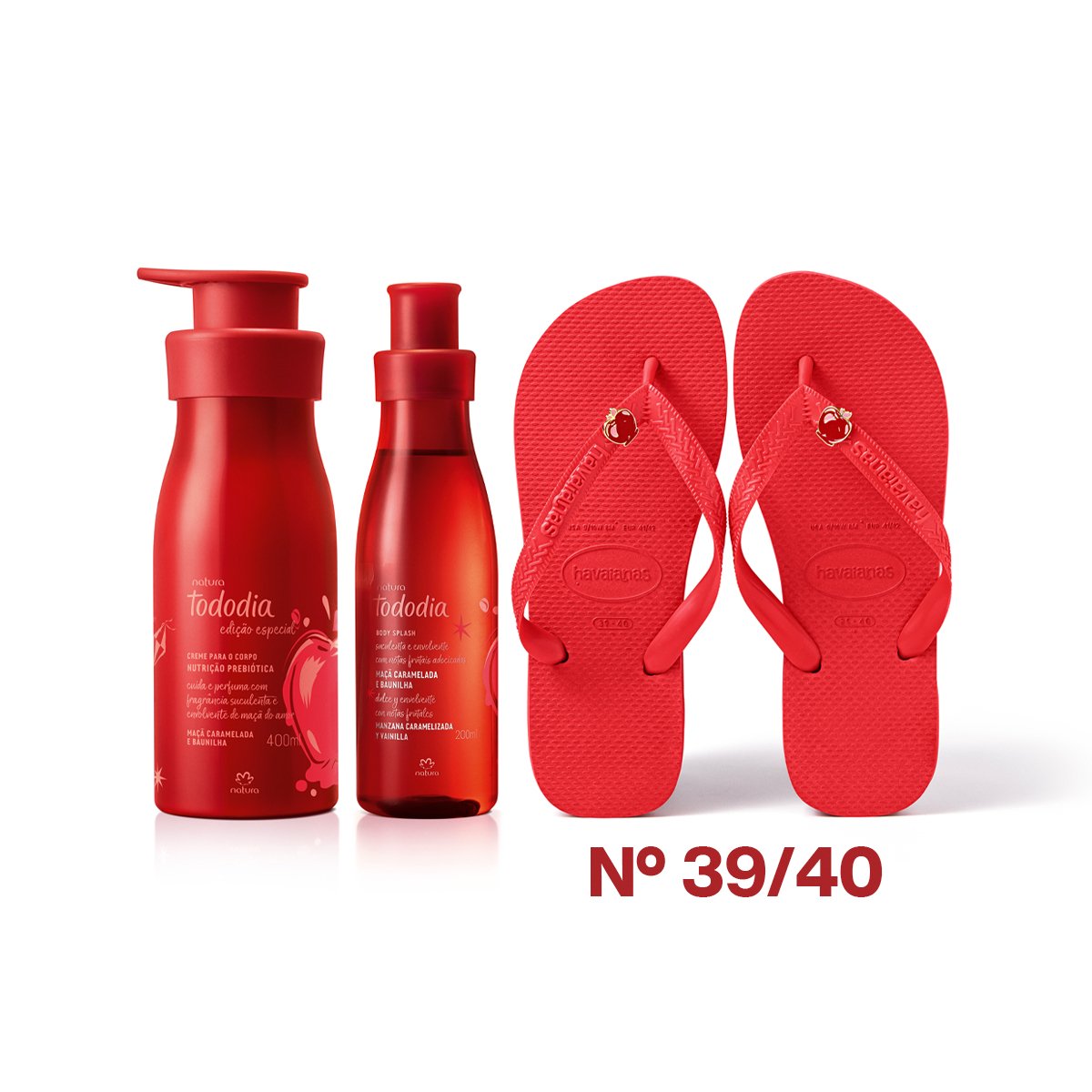 • uma parceria que celebra essa festa linda, cheirosa, brasileira e colorida • kit de edição exclusiva e limitada • combina a hidratação e a fragrância suculenta de Tododia Maçã Caramelada e Baunilha com o estilo e conforto de Havaianas. contém creme desodorante nutritivo para o corpo 400 ml body splash desodorante colônia 200 ml chinelo vermelho tamanho 39/40 cartela de pins maçã do amor e caixa da collab Tododia e Havaianas. *oferta compre e ganhe válida nas lojas participantes e no site natura.com.br. não cumulativa com outras promoções. sujeita à disponibilidade de estoque e não aberta para trocas. consulte disponibilidade.