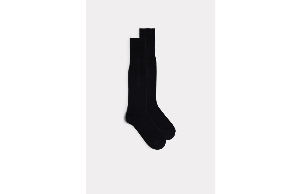 Meias altas de homem em algodão quente com punho. O fio torna este artigo macio e quente ao mesmo tempo.