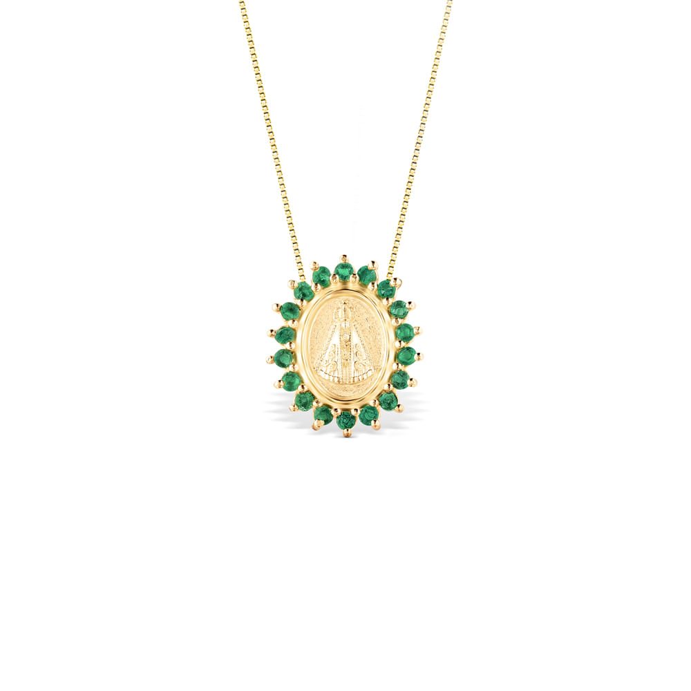Pingente Medalha N.Sra. Aparecida em Ouro Amarelo 18k com Esmeraldas