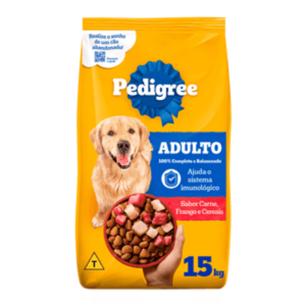 Ração Pedigree Cães Adultos Raças Médias e Grandes Carne, Frango e CereaisDescubra a nutrição profissional que seu cão merece com a Ração Pedigree Cães Adultos Raças Médias e Grandes Carne, Frango e Cereais. Um alimento premium que oferece uma fórmula 100% completa e balanceada, projetada para proporcionar uma ótima digestão e fezes firmes, facilitando a limpeza.Sem corantes ou aromatizantes artificiais, a Ração Pedigree para Raças Grandes é cuidadosamente formulada para proteger a saúde do seu pet. Rica em vitamina E e selênio, oferece poderosos antioxidantes que fortalecem o sistema imunológico do seu cão, mantendo-o saudável em todas as fases da vida.Com fibras naturais para promover uma digestão ótima, e Ômega 6 para uma pele e pelo saudáveis, a Ração para Cães Médios da Pedigree é uma escolha excelente para o bem-estar do seu amigo de quatro patas. Além disso, os grãos selecionados e a proteína de alta qualidade garantem músculos fortes e energia para uma vida ativa e feliz. Experimente a Ração Pedigree e proporcione ao seu cão uma alimentação que ele vai adorar e que cuida da sua saúde de dentro para fora.Aqui na Cobasi você encontra a maior variedade de alimentos para seu pet como a Ração Pedigree Cães Adultos Raças Médias e Grandes Carne, Frango e Cereais com preço baixo. Compre pelo site, app ou em uma de nossas lojas.Composição BásicaFarinha de carne e ossos de bovino, farinha de vísceras de aves, milho moído*, sorgo integral moído, óleo de frango, farelo de soja**, glúten de milho*, minerais (cloreto de sódio, cloreto de potássio, óxido de zinco, sulfato de cobre pentahidratado, iodato de cálcio, selenito de sódio), hidrolisado de carne de aves e fígado de aves e suíno, DL-metionina, vitaminas (A, D3, E, B1, B2, B6, B12, niacina (ácido nicotínico), ácido pantotênico, ácido fólico, cloreto de colina), silicato de alumínio, BHT (butilhidroxitolueno), caramelo IV.Eventuais substitutivos: farinha de carne e ossos de suíno, quirera de arroz, cevada integral moída, trigo moído, farelo de glúten de milho*, farelo de trigo, casca de soja**, hidrolisado de fígado de aves e suínos.Espécies doadoras do gene: agrobacterium tumefaciens, bacillus thuringiensis, streptomyces viridochromogenes, zea mays, sphingobium herbicidorovans, dicossoma sp., diabrotica firgifera, thermoccocales spp, bacillus substilis.**espécies doadoras do gene: agrobacterium tumefaciens, bacillus thuringiensis, streptomyces viridochromogenes, arabidopsis thaliana, delftia acidovorans, pseudomonas fluorescens, zea mays, stenotrophomonas maltophilia, B.T. Var azawai e kurstaqui, agrobacterium sp.Contém milho e soja transgênicos.Níveis de GarantiaUmidade (máx.)120 g/kg12%Proteína Bruta (mín.)210 g/kg21%Extrato Etéreo (mín.)90 g/kg9%Matéria Fibrosa (máx.)40 g/kg4%Matéria Mineral (máx.)100 g/kg10%Cálcio (mín.)10 g/kg1%Cálcio (máx.)24 g/kg2,4%Fósforo (mín.)8000 mg/kg0,8%Sódio (mín.)2000 mg/kg-Potássio (mín.)5000 mg/kg-Ômega 6 (mín.)23 g/kg-Vitamina E (mín.)35 UI/kg-Selênio (mín.)0,31 mg/kg-Metionina (mín.)2000 mg/kg-Zinco (mín.)75 mg/kg-Ferro (mín.)60 mg/kg-Energia Metabolizável3500 kcal/kg-Enriquecimento Mínimo por KgVitamina A: (6000 UI), Vitamina B1: (3,0 mg), Vitamina B2: (6,0 mg), Vitamina B6: (1,8 mg), Vitamina B12: (40,0 µg), Vitamina D3: (600 UI), Niacina: (20,0 mg), Colina: (500 mg), Iodo: (1,0 mg), Zinco: (75,0 mg), Ácido Pantotênico: (14,0 mg), Ácido Fólico: (0,30 mg), Cobre: (8,0 mg).Quantidade diária recomendadaPeso do animalQuantidadeMédio (10 a 25kg)155 a 305gGrande (25 a 45kg)305 a 475gGigante (> 45kg)> 475gGuia para troca de raçãoCaso haja necessidade em inserir uma nova ração para seu pet, é importante que a troca seja gradual e crescente. Para garantir uma perfeita adaptação e aceitação, você pode seguir a sugestão abaixo ou conforme orientação do médico-veterinário: