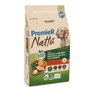 Ração Premier Nattu Cães Adultos AbóboraA alimentação dos nossos cachorros são a parte mais importante para uma boa saúde. Pensando nisso a Ração Premier Nattu Cães Adultos Abóbora é ideal pois conta com ingredientes nutritivos e com satisfação comprovada.A Ração Natural contribui para um bom funcionamento do intestino através da combinação de nutrientes de alta digestibilidade, fibras naturais e prebiótico. Conta também com uma equilibrada formulação de ômegas e minerais contribuindo para uma pele nutrida e pelagem sedosa.Livre de corantes e aromatizantes, a Ração Nattu da Premier é recomendada para cães adultos por trazer em sua formulação ingredientes de alta densidade nutricional, oferecendo nutrientes e poucas calorias, ideal para uma dieta equilibrada.Na Cobasi você encontra a maior variedade de alimentos para seu pet como a Ração Premier Nattu Cães Adultos Abóbora com preço especial. Compre pelo site, app ou em uma de nossas lojas.Ingredientes:Farinha de vísceras de frango (25%), glúten de milho (não transgênico), ovo em pó, quirera de arroz, complexo de vegetais – 10,0% (abóbora, brócolis desidratado, extrato de marigold (Tagetes erecta), grão de quinoa, mirtilo (blueberry), polpa desidratada de beterraba), gordura de frango, óleo refinado de peixe, cloreto de potássio, cloreto de sódio, bentonita, BHA (Butilhidroxianisol), BHT (Butilhidroxitolueno), extrato de yucca, hidrolisado de fígado de aves e suíno, L-carnitina, parede celular de levedura (fonte de beta glucanas), parede celular de levedura (fonte de mananoligossacarídeos), taurina, acetato de DL-alfa tocoferol, acetato de retinol, ácido ascórbico monofosfato, ácido fólico, ácido pantotênico, biotina, bissulfito de menadiona nicotinamida, cianocobalamina, cloreto de colina, colecalciferol, niacina (ácido nicotínico), piridoxina, riboflavina, tiamina, ferro aminoácido quelato, iodeto de cálcio, manganês aminoácido quelato, selenometionina hidroxi análoga, sulfato de cobre pentahidratado, sulfato de ferro, sulfato de manganês, sulfato de zinco monohidratado, zinco aminoácido quelato.Níveis de GarantiaUmidade (máx.)100 g/kg10,00%Proteína Bruta (mín.)250 g/kg25,00%Extrato Etéreo (mín.)150 g/kg15,00%Matéria Mineral (máx.)70 g/kg7,00%Matéria Fibrosa (máx.)40 g/kg4,00%Fibra Dietética Total (máx.)80 g/kg8,00%Cálcio (máx.)14 g/kg1,40%Cálcio (mín.)8.000 mg/kg0,80%Fósforo (mín.)6.000 mg/kg0,60%Sódio (mín.)1.700 mg/kg0,17%Potássio (mín.)5.800 mg/kg0,58%Ômega 6 (mín.)20 g/kg2,00%Ômega 3 (mín.)2.800 mg/kg0,28%Taurina (mín.)1.000mg/kg0,10%L-carnitina (mín.)500 mg/kg0,05%Mananoligossacarídeos (mín.)500 mg/kg0,05%Beta glucanas (mín.)400 mg/kg0,04%Energia Metabolizável3.946 kcal/kgEnriquecimento Mínimo por Kg:Ácido Fólico: 0,435mg; Ácido Pantotênico: 24,60mg; Biotina: 0,50mg; Cobre: 10,37mg; Colina: 1.900,00mg; Ferro: 52,12mg; Iodo: 1,50mg; Manganês: 8,37mg; Niacina: 28,35mg; Selênio: 0,20mg; Vitamina A: 10.530,00 UI; Vitamina B1: 3,75mg; Vitamina B12: 58,05mcg; Vitamina B2: 10,35mg; Vitamina B6: 2,55mg; Vitamina C: 100,00mg; Vitamina D3: 958,50 UI; Vitamina E: 186,66 UI; Vitamina K3: 1,87mg; Zinco: 125,00mg.Guia para troca de raçãoCaso haja necessidade em inserir uma nova ração para seu pet, é importante que a troca seja gradual e crescente. Para garantir uma perfeita adaptação e aceitação, você pode seguir a sugestão abaixo ou conforme orientação do médico-veterinário: