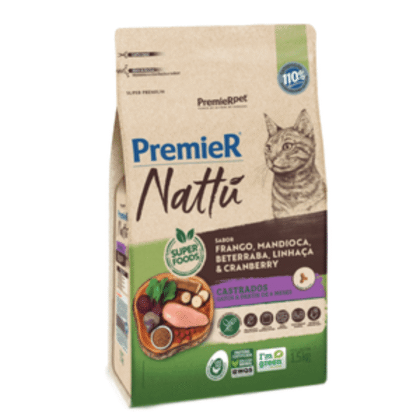 Ração Premier Nattu Gatos Adultos Castrados MandiocaGatos castrados tem necessidades especiais e precisam de uma alimentação que atenda a isso. A Ração Premier Nattu Gatos Adultos Castrados Mandioca é recomendada a partir dos 6 meses de idade para os felinos que passaram por este procedimento cirúrgico e que necessitam de uma dieta equilibrada. Formulada com ingredientes nobres, sem corantes e aromatizantes artificiais.Ideal para o controle do peso através da L-carnitina e dos teores moderados de calorias, a Ração Premier Gatos Castrados ainda é contribui para um trato urinário saudável e um bom funcionamento do intestino.Na Cobasi você encontra a maior variedade de alimentos para seu pet como a Ração Premier Nattu Gatos Adultos Castrados Mandioca com preço especial. Compre pelo site, app ou em uma de nossas lojas.Ingredientes:Farinha de vísceras de frango, glúten de milho (não transgênico), ovo em pó, proteína isolada de soja, quirera de arroz, aveia, fibra de cana-de-açúcar, complexo de vegetais – 11,0% (arando (cranberry), beterraba, extrato de marigold (Tagetes erecta), farinha de mandioca, grão de linhaça, polpa desidratada de beterraba), gordura de frango, óleo refinado de peixe, cloreto de potássio, cloreto de sódio, ácido cítrico, bentonita, BHA (Butilhidroxianisol), BHT (Butilhidroxitolueno), cloreto de amônio, difosfato (pirofosfato) trissódico, DL-metionina, extrato de yucca (0,06%), hexametafosfato de sódio, hidrolisado de fígado de suíno, L-carnitina, parede celular de levedura (mananoligossacarídeos (0,20%)), sulfato de amônio, taurina, acetato de DL-alfa tocoferol, acetato de retinol, ácido ascórbico monofosfato, ácido fólico, ácido pantotênico, biotina, bissulfito de menadiona nicotinamida, cianocobalamina, cloreto de colina, colecalciferol, niacina (ácido nicotínico), piridoxina, riboflavina, tiamina, ferro aminoácido quelato, iodeto de cálcio, manganês aminoácido quelato, selenometionina hidroxi análoga, sulfato de cobre pentahidratado, sulfato de ferro, sulfato de manganês, sulfato de zinco monohidratado, zinco aminoácido quelato.Níveis de garantia:Umidade (máx.)100 g/kg10,00%Proteína Bruta (mín.)333 g/kg33,30%Extrato Etéreo (mín.)120 g/kg12,00%Matéria Mineral (máx.)85 g/kg8,50%Matéria Fibrosa (máx.)45 g/kg4,50%Cálcio (máx.)14 g/kg1,40%Cálcio (mín.)10 g/kg1,00%Fósforo (mín.)8.400 mg/kg0,84%Sódio (mín.)4.000 mg/kg0,40%Potássio (mín.)8.000 mg/kg0,80%Magnésio (máx.)1.000 mg/kg0,10%Ômega 6 (mín.)15 g/kg1,50%Ômega 3 (mín.)2.000 mg/kg0,20%Metionina (mín.)8.000 mg/kg0,80%Taurina (mín.)1.500 mg/kg0,15%L-Carnitina (mín.)250 mg/kgpH Urinário6,2 – 6,8Energia Metabolizável3.874 kcal/kgEnriquecimento Mínimo por Kg:Ácido fólico: 1,50mg; Ácido pantotênico: 15,40mg; Biotina: 0,50mg; Cobre: 12,50mg; Colina: 3.200,00mg; Ferro: 133,80mg; Iodo: 1,80mg; Manganês: 12,50mg; Niacina: 84,42mg; Selênio: 0,20mg; Vitamina A: 18.000,00 UI; Vitamina B1: 11,80mg; Vitamina B12: 70,50mcg; Vitamina B2: 8,40mg; Vitamina B6: 6,60mg; Vitamina C: 100,00mg; Vitamina D3: 825,00 UI; Vitamina E: 350,00 UI; Vitamina K3: 1,00mg; Zinco: 125,00mg.Guia para troca de raçãoCaso haja necessidade em inserir uma nova ração para seu pet, é importante que a troca seja gradual e crescente. Para garantir uma perfeita adaptação e aceitação, você pode seguir a sugestão abaixo ou conforme orientação do médico-veterinário: