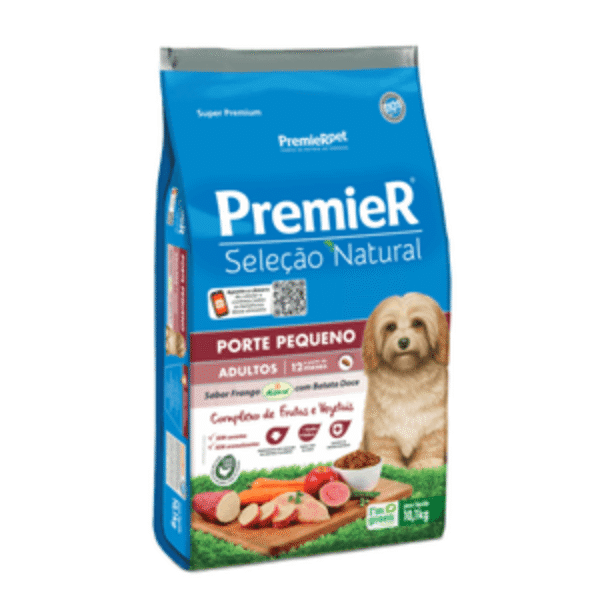 Ração Premier Seleção Natural Cães Adultos Raças Pequenas Frango com Batata DoceA Ração Premier Seleção Natural Cães Adultos Raças Pequenas Frango com Batata Doce conta com uma exclusiva fonte de proteína proveniente do Frango Korin. Sua formulação com batata doce favorece o controle glicêmico e proporciona uma vida mais saudável e equilibrada ao seu cãozinho.Naturalmente saudável devido ao seu complexo de fibras e vegetais, tem oito ingredientes selecionados como fontes naturais de fibras e sais minerais, que nutrem de maneira saudável e com o sabor natural dos alimentos, devido ao baixo teor de sódio.Encontre a maior variedade de alimentos para seu pet como a Ração Premier Seleção Natural Cães Adultos Raças Pequenas Frango com Batata Doce com preço especial aqui na Cobasi. Compre pelo site, app ou em uma de nossas lojas.Ingredientes:Farinha de vísceras de frango (Korin), farinha de torresmo, glúten de milho (não transgênico), ovo em pó, farinha de batata doce, quirera de arroz, complexo de frutas e vegetais – 10,0% (beterraba, brócolis desidratado, cenoura, ervilha moída desidratada, espinafre desidratado, farelo de goiaba, fibra de maçã, polpa desidratada de beterraba e salsa desidratada), banha refinada, gordura de frango, óleo refinado de peixe, cloreto de potássio, bentonita, BHA (Butilhidroxianisol), BHT (Butilhidroxitolueno), extrato de yucca, hidrolisado de fígado de aves e suíno, parede celular de levedura (fonte de mananoligossacarídeos), taurina, vitamina A, vitamina B1, vitamina B2, vitamina B3, vitamina B5, vitamina B6, vitamina B7, vitamina B9, vitamina B12, vitamina C, cloreto de colina, vitamina D3, vitamina E, vitamina K3, ferro aminoácido quelato, iodeto de cálcio, manganês aminoácido quelato, selenometionina hidroxi análoga, sulfato de cobre pentahidratado, sulfato de ferro, sulfato de manganês, sulfato de zinco monohidratado, zinco aminoácido quelato.Níveis de GarantiaUmidade (máx.)100 g/kg10,00%Proteína Bruta (mín.)250 g/kg25,00%Extrato Etéreo (mín.)160 g/kg16,00%Matéria Mineral (máx.)75 g/kg7,50%Matéria Fibrosa (máx.)40 g/kg4,00%Cálcio (máx.)15 g/kg1,50%Cálcio (mín.)8.000 mg/kg0,80%Fósforo (mín.)6.000 mg/kg0,60%Sódio (mín.)1.700 mg/kg0,17%Potássio (mín.)5.800 mg/kg0,58%Taurina (mín.)1.000 mg/kg0,10%Ômega 6 (mín.)20 g/kg2,00%Ômega 3 (mín.)2.800 mg/kg0,28%Mananoligossacarídeos (mín.)480 mg/kg0,048%Energia Metabolizável4.015 kcal/kgEnriquecimento Mínimo por Kg:Ácido fólico: 0,44mg; Ácido pantotênico: 24,60mg; Biotina: 0,50mg; Cobre: 10,37mg; Colina: 1.900,00mg; Ferro: 52,12mg; Iodo: 1,50mg; Manganês: 8,37mg; Niacina: 28,35mg; Selênio: 0,20mg; Vitamina A: 10.530,00 UI; Vitamina B1: 3,75mg; Vitamina B12: 58,05mcg; Vitamina B2: 10,35mg; Vitamina B6: 2,55mg; Vitamina C: 100mg; Vitamina D3: 958,50 UI; Vitamina E: 186,66 UI; Vitamina K3: 1,87mg; Zinco: 125,00mg.Guia para troca de raçãoCaso haja necessidade em inserir uma nova ração para seu pet, é importante que a troca seja gradual e crescente. Para garantir uma perfeita adaptação e aceitação, você pode seguir a sugestão abaixo ou conforme orientação do médico-veterinário: