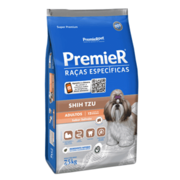 Ração Premier Shih Tzu Adultos SalmãoCães da raça Shih Tzu são muito inteligentes e adoram aprender. Porém é importante oferecer uma alimentação especializada para um bom desenvolvimento. A Ração Premier Shih Tzu Adultos Salmão é a mais indicada para isso.A Ração para Shih Tzu conta com grãos em formato especial que facilita a preensão por cães braquicefálicos (focinho achatado). Contribui com a pelagem bonita e pele saudável através de ácidos graxos essenciais ômegas 3 e 6, biotina e zinco.Através da combinação de ingredientes de alta digestibilidade, fibras especiais e prebiótico a Ração Premier favorece a saúde intestinal e ainda auxilia na redução do odor e volume das fezes.Na Cobasi você encontra a Ração Premier Shih Tzu Adultos Salmão com preço especial. Compre pelo site, app ou em uma de nossas lojas.Ingredientes:Farinha de vísceras de frango, farinha de salmão, glúten de milho (não transgênico), glúten de trigo, ovo em pó, quirera de arroz, polpa desidratada de beterraba, banha refinada, gordura de frango, óleo refinado de peixe, cloreto de potássio, cloreto de sódio, sulfato de condroitina, sulfato de glicosamina, ácido propiônico, bentonita, BHA (Butilhidroxianisol), BHT (Butilhidroxitolueno), extrato de yucca (0,06%), hexametafosfato de sódio (0,10%), hidrolisado de fígado de aves e suíno, parede celular de levedura (mananoligossacarídeos (0,20%)), vitamina A, vitamina B1, vitamina B2, vitamina B3, vitamina B5, vitamina B6, vitamina B7, vitamina B9, vitamina B12, vitamina C, cloreto de colina, vitamina D3, vitamina E, vitamina K3, ferro aminoácido quelato, iodeto de cálcio, manganês aminoácido quelato, selenometionina hidroxi análoga, sulfato de cobre pentahidratado, sulfato de ferro, sulfato de manganês, sulfato de zinco monohidratado, zinco aminoácido quelato.Níveis de Garantia:Umidade (máx.)100 g/kg10,00%Proteína Bruta (mín.)250 g/kg25,00%Extrato Etéreo (mín.)160 g/kg16,00%Matéria Mineral (máx.)70 g/kg7,00%Matéria Fibrosa (máx.)35 g/kg3,50%Cálcio (máx.)13 g/kg1,30%Cálcio (mín.)7.000 mg/kg0,70%Fósforo (mín.)4.500 mg/kg0,45%Sódio (mín.)2.000 mg/kg0,20%Potássio (mín.)5.800 mg/kg0,58%Ômega 6 (mín.)27 g/kg2,70%Ômega 3 (mín.)5.000 mg/kg0,50%Sulfato de condroitina100 mg/kgSulfato de glicosamina300 mg/kgEnergia Metabolizável4.003 kcal/kgEnriquecimento Mínimo por Kg:Ácido fólico: 1,00mg; Ácido pantotênico: 36,90mg; Biotina: 5,00mg; Cobre: 10,37mg; Colina: 1.900,00mg; Ferro: 52,12mg; Iodo: 1,50mg; Manganês: 8,37mg; Niacina: 42,53mg; Selênio: 0,20mg; Vitamina A: 15.795,00 UI; Vitamina B1: 5,63mg; Vitamina B12: 87,08mcg; Vitamina B2: 15,53mg; Vitamina B6: 3,83mg; Vitamina C: 200,00mg; Vitamina D3: 1.100,00 UI; Vitamina E: 400,00 UI; Vitamina K3: 0,56mg; Zinco: 125,10mg.Guia para troca de raçãoCaso haja necessidade em inserir uma nova ração para seu pet, é importante que a troca seja gradual e crescente. Para garantir uma perfeita adaptação e aceitação, você pode seguir a sugestão abaixo ou conforme orientação do médico-veterinário: