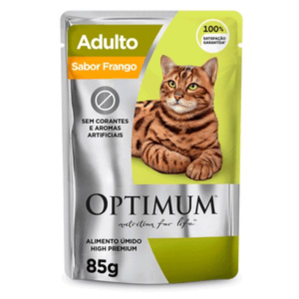Ração Úmida Optimum Sachê Gatos Adultos FrangoA Ração Úmida Optimum Sachê Gatos Adultos Frango foi desenvolvida usando as melhores matérias-primas, proteínas cuidadosamente selecionadas e nutrientes essenciais.Contém Taurina, nutriente que ajuda na manutenção da saúde do coração do seu gato, tem um controle mineral e pH que auxiliam na manutenção da saúde do trato urinário, além de possuir Zinco e Ômega 6, elementos que contribuem para a saúde da pele e do pelo do seu gato.Seu gato merece uma alimentação de qualidade, com todos os nutrientes necessários para uma vida saudável. Aqui na Cobasi você encontra a Ração Úmida Optimum Sachê Gatos Adultos Frango com preço especial e diversos mimos para seu pet. Aproveite!Composição BásicaCarne mecanicamente separada de frango (mín. 3%), Carcaça de frango, Pé de frango, Miúdos de suínos, Farinha de trigo, Plasma sanguíneo desidratado de suíno, Proteína concentrada de soja, Polpa desidratada de beterraba, Água, Amido modificado de milho, Minerais (Cloreto de sódio, Cloreto de potássio, Óxido de magnésio, Sulfato de cobre pentahidratado, Iodato de cálcio, Óxido de zinco, Óxido de manganês), Taurina, Vitaminas (D3, E, C, B1, B2, B6, K3, Niacina (Ácido nicotínico), Ácido fólico, Cloreto de colina), Tripolifosfato de sódio, Xilose, Glicina, Goma xantana, Caramelo IV. Eventuais substitutivos: Miúdos de frango, Óleo de frango, Miúdos de bovinos, Glúten de trigo, Fosfato bicálcico, Celulose.Níveis de garantiaVitamina B110 MgVitamina B20,30 MgVitamina B60,3 MgVitamina C140 MgVitamina D3127 UIVitamina E40 UIVitamina K30,07 MgNiacina2,1 MgColina158 MgIodo0,4 MgZinco17 MgManganês3,8 MgÁcido Fólico0,1 MgCobre0,8 MgEnriquecimento por kg de produtoVitamina B1 (10,0 mg), vitamina B2 (0,30 mg), vitamina B6 (0,3 mg), vitamina C (140 mg), vitamina D3 (127 UI), vitamina E (40 UI), vitamina K3 (0,07 mg), niacina (2,1 mg), colina (158 mg), iodo (0,4 mg), zinco (17 mg), manganês (3,8 mg), ácido fólico (0,1 mg), cobre (0,8 mg).Quantidade Diária RecomendadaPeso do GatoQuatidade4 kg3 sachês por diaPesquisas indicam que alimentos úmidos trazem inúmeros benefícios.1 sachê/dia = parte do consumo de água diário recomendado.Você pode adaptar as quantidades em função da idade e nível de atividade física do seu gato.A introdução de um novo alimento deve ser gradual – faça isso por um período de 7 a 10 dias, aumentando a quantidade do novo alimento a cada dia.