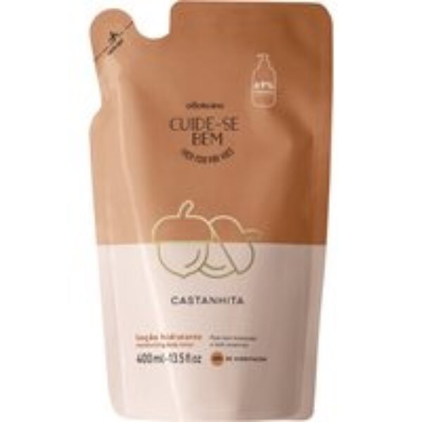 O Refil Cuide-se Bem Castanhita Loção Hidratante Desodorante Corporal é a forma mais sustentável e econômica de repor o conteúdo da sua loção hidratante preferida! Este é o refil da Cuide-se Bem Loção Hidratante Castanhita , que cuida sua pele com muito carinho. A loção hidratante oferece uma hidratação poderosa, agindo por até 48 horas na pele. Revela uma pele macia e extremamente hidratada. Não só hidrata intensamente como ainda revela uma fragrância floriental ambarada na medida certa, proporcionando uma sensação de conforto e aconchego para a pele. Contém: 400ml.