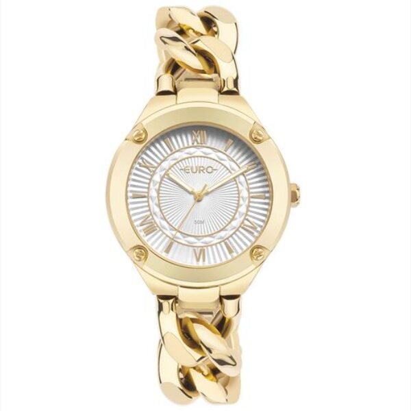 A linha Chains remete a sofisticação da Joalheria ao mundo Euro. Sua pulseira com correntes douradas traz um ar luxuoso para o relógio e a caixa marcante possui aro trabalhado com parafusos, detalhe que deixa o modelo ainda mais diferenciado. Ideal para as mulheres que gostam de marcar presença em qualquer situação com acessórios mais elegantes. Produto com caixa de metal e pulseira de aço inoxidável em banho dourado, mostrador branco com aplicação de textura e números romanos, tamanho de caixa 40mm e resistência à água 50m.