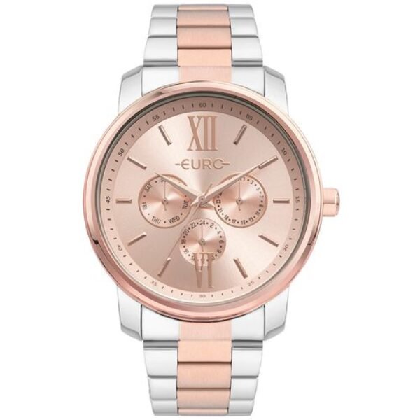 O Multiglow possui um ar tradicional contemporâneo. Seu banho bicolor prata com rosé é complementado pelo lindo mostrador cor de rosa, que traz modernidade à peça. Ele conta com o design clássico e a elegância do mecanismo multifunção para trazer sofisticação ao dia a dia da mulher Euro, além dos belos números romanos nos marcadores de hora.