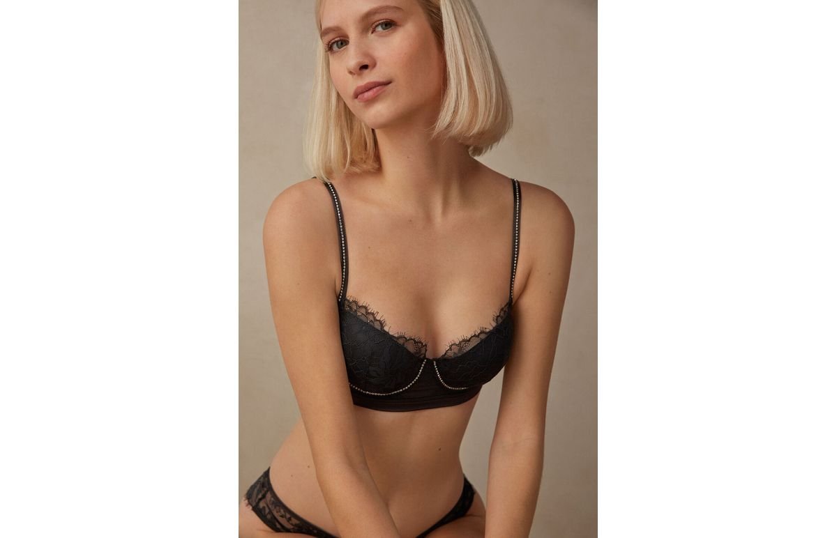 Sutiã balconette Sofia com leve bojo e com aros, confeccionado em renda elástica com estampa floral e detalhes em cetim. Os strass dão um toque de luz e tornam-se num acessório de glamour. As alças são revestidas em cetim e reguláveis na parte posterior. É um modelo que confere um excelente suporte e realça o decote, arredondando as formas e criando um visual romântico e feminino.