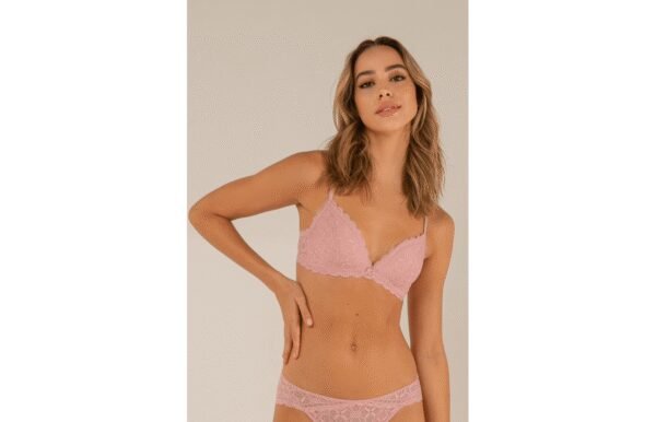 Sutiã Triângulo em Renda Tiziana, levemente almofadado, sem aros com interior das copas em algodão. Contorno do tórax e alças reguláveis.