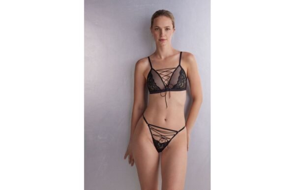 Sutiã triângulo sem almofada e sem aros, com tiras laterais que ajudam a conter o seio. Caracteriza-se pelo fecho frontal e detalhe cruzado com elásticos, decorado com renda e pequenos berloques dourados, causando um efeito sensual à peça. Possui acabamentos elegantes em cetim. As alças, revestidas em cetim, são ajustáveis na parte de trás.A modelo tem 1,75 m de altura e veste o tamanho 42B.É o sutiã ideal para quem busca um efeito natural com um estilo romântico, mas muito sensual.